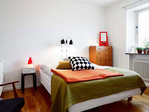 Bên cạnh đồ gỗ, chủ nhà giúp căn phòng ngủ sinh động với sắc màu trẻ trung như xanh, đỏ.