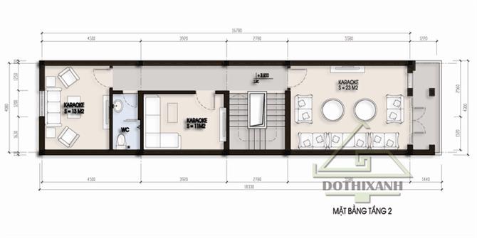 Tầng 2 và 3: bố trí mỗi tầng 3 phòng hát với diện tích lần lượt là 11, 13 và 23 m2. Tổng cộng 2 tầng gồm 4 phòng hát nhỏ và 2 phòng hát lớn. Mỗi tầng được bố trí một khu vệ sinh chung rộng 3,5m2.