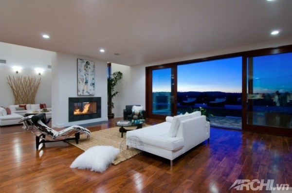 Với không gian rộng, phòng khách được KTS William MacCollum bài trí nội thất sang trọng, hiện đại với bộ sofa trắng nổi bật trên nền sàn gỗ màu nâu trầm. Trang trí cho phòng khách bằng điểm nhấn với bức tranh bắt mắt trên tường và tạo sự rộng thoáng cho căn phòng bởi cửa kính lớn.