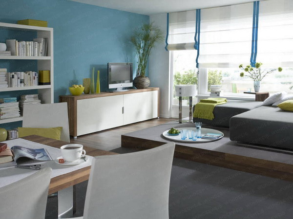 Tông màu ghi tạo thành màu nền lý tưởng cho các màu khác (cụ thể ở đây là màu xanh nước biển và màu trắng) nổi bật lên đồng thời mang lại vẻ đẹp sang trọng cho căn phòng. Tông màu xanh nước biển được dùng cho mảng tường đối diện sofa và viền rèm cửa, có tác dụng trang trí cho không gian nơi đây thêm sinh động và đẹp mắt. Bên cạnh đó, sofa có cùng tông màu với màu sàn giúp "ăn gian" diện tích.