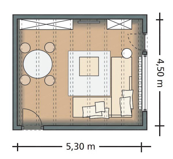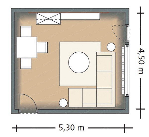 Vẫn sử dụng sofa góc nhưng khác với ở giải pháp 1, một chiếc bàn tròn nhỏ sẽ được sử dụng. Bên dưới chiếc bàn này có trải thảm cùng tông màu giúp định vị khu vực phòng khách thay vì sử dụng bậc thang như ở trên.