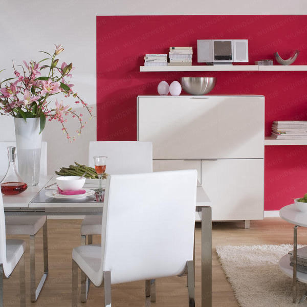 Màu trắng là chủ đạo, được sử dụng cho các nội thất chính trong phòng và màu tường, cửa sổ, cửa chính, tạo ra một không gian trẻ trung. Màu đỏ dùng làm điểm nhấn thông qua rèm và mảng tường đối diện sofa, đem đến ấn tượng nổi bật cho căn phòng.