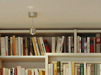 Sách vở, tài liệu chiếm một khối lượng khá nhiều. Vì thế, KTS đã có một phương án tuyệt vời, đó là sử dụng kệ sách 2 phần: Phần trong là kệ cố định gắn vào tường, phần ngoài là 2 chiếc kệ sách di động dành để bày biện sách vở dùng thường xuyên. Để dễ dàng hơn trong việc lựa chọn sách vở ở bất kỳ ngăn nào của kệ sách, dù trong hay ngoài, KTS đã thiết kế con lăn gắn giữa phần trong và phần ngoài giá sách.