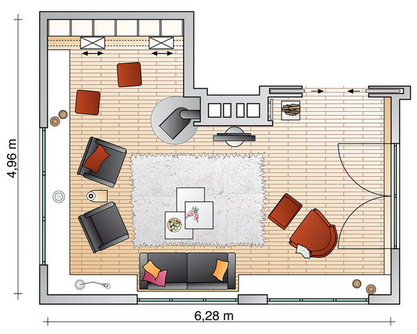 Yêu cầu của gia chủ với KTS khi cải tạo lại phòng khách của họ đó là tạo một không gian với hai chức năng chính: đọc sách, nghiên cứu và tiếp khách, giải trí. Họ muốn nhờ KTS thiết kế một không gian trẻ trung, vui tươi và đồ đạc không quá rườm rà. Với diện tích tương đối "lý tưởng" cho việc sắp xếp 4,96x6,28m khuyết góc trở thành một không gian đẹp ấn tượng.