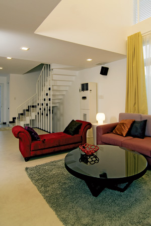 3. Phòng khách một căn hộ có khoảng thông tầng cao, chính vì lợi thế đó, khu vực tiếp khách được bố trí ngay trung tâm. Phòng khách cũng chung không gian với phòng ăn, bếp. Từ bên trong có thể nhìn ra khoảng vườn ôm sát bên ngoài, chính góc nhìn này đã làm cho căn phòng dường như rộng hơn. Bộ ghế màu sậm nổi bật nhấn cho vị trí quan trọng của nó, các đồ vật xung quanh có màu nhạt hơn để tạo sự chính phụ.